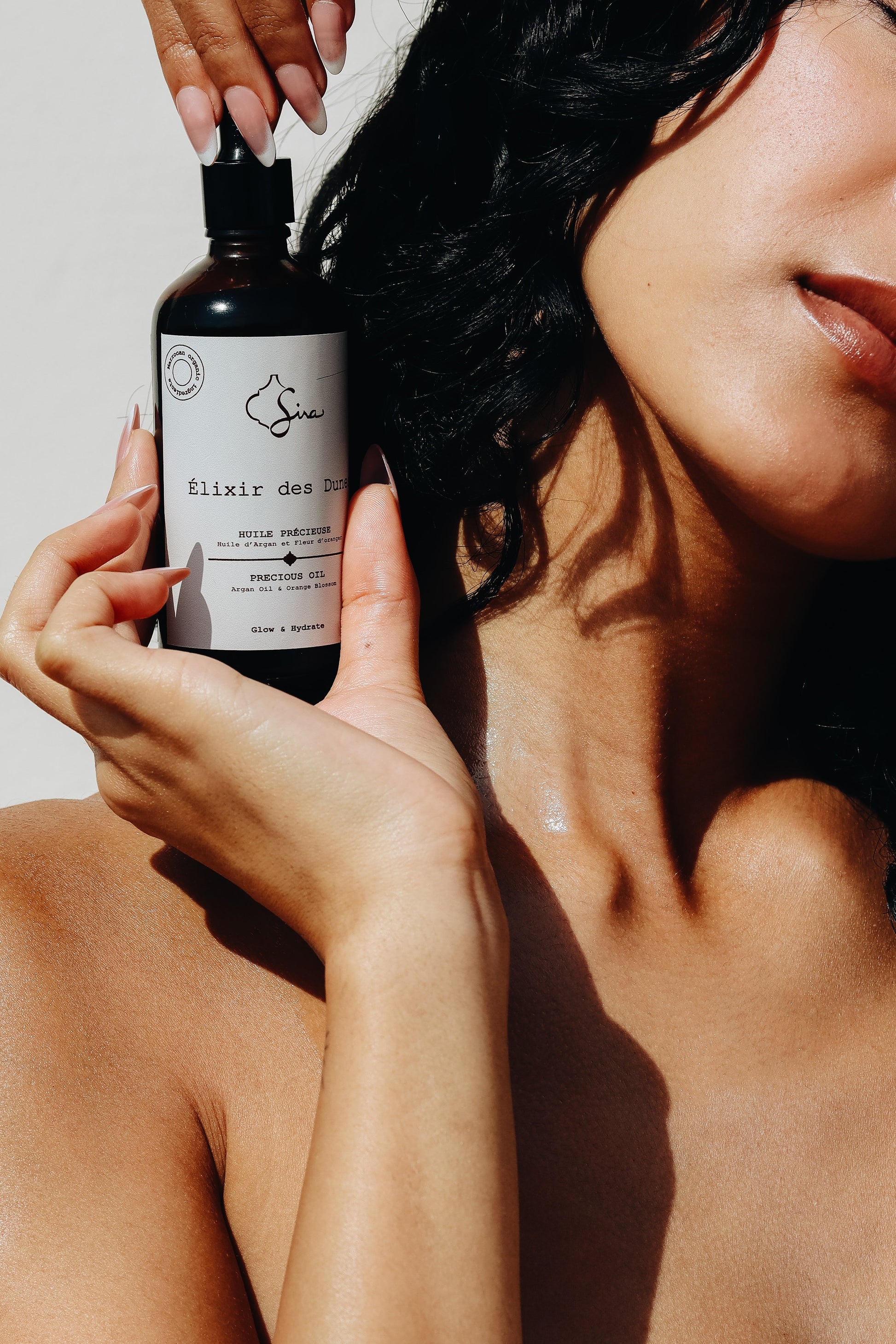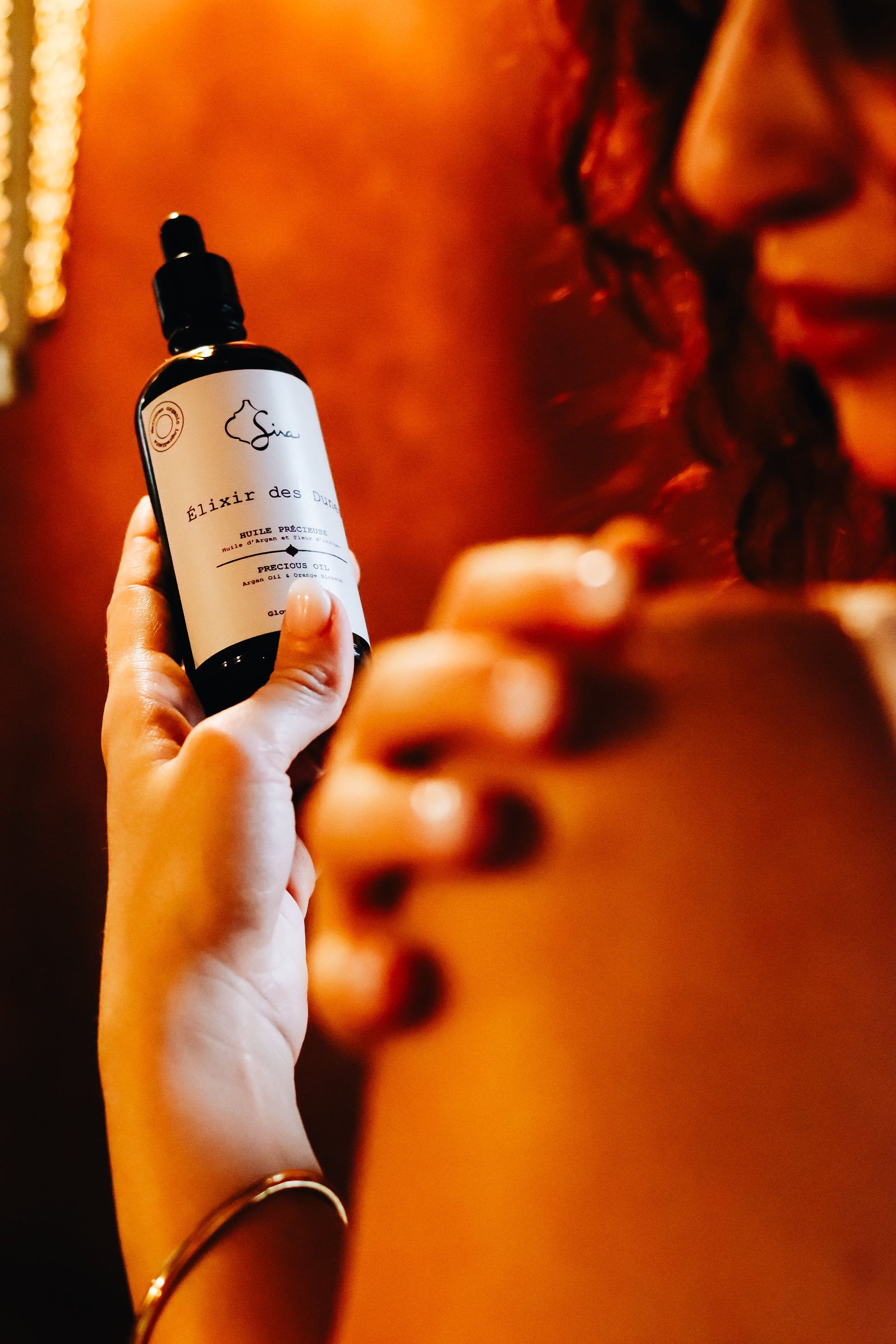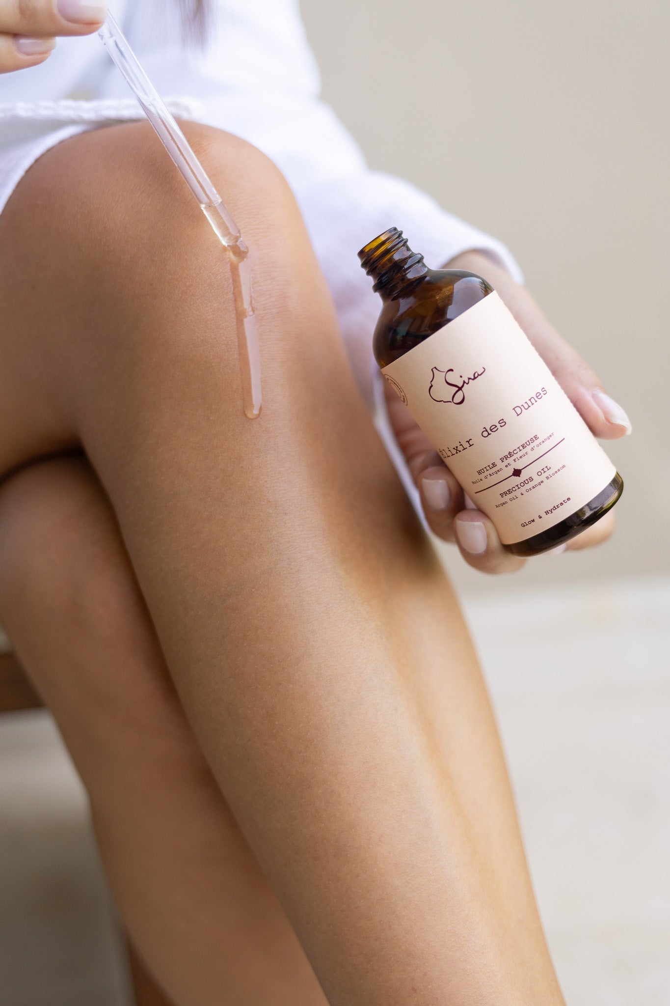 quelques gouttes de l’Élixir des Dunes dans le creux de vos mains. Chauffez le produit entre vos paumes et appliquez généreusement sur l’ensemble du corps. Laissez la texture légère glisser sur votre peau, massant délicatement les zones sèches ou sensibles pour une absorption
