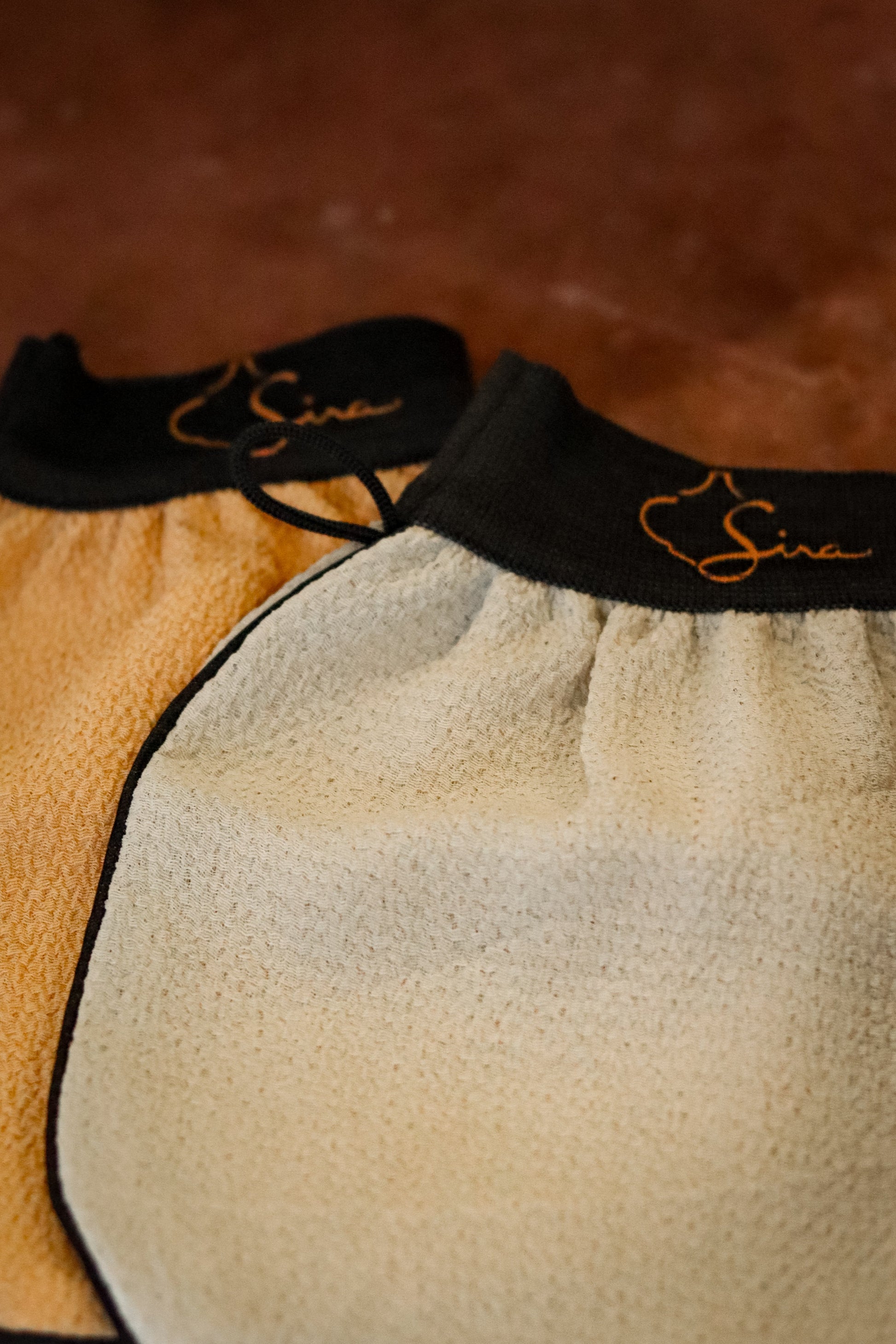Beige comme le sable du désert, ce gant exfoliant est l’allié incontournable des rituels de beauté ancestraux. Inspiré des traditions marocaines et turques, il sublime la peau par une exfoliation profonde, tout en douceur. Un toucher régénérant, un moment rien qu’à soi.